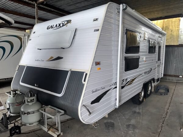 Externally this caravan sits on a 4″? chassis with leaf spring suspension and 16″? wheels. This caravan has a roll out awning, hot water system, twin batteries, twin solar, security door and rear bumper bar.