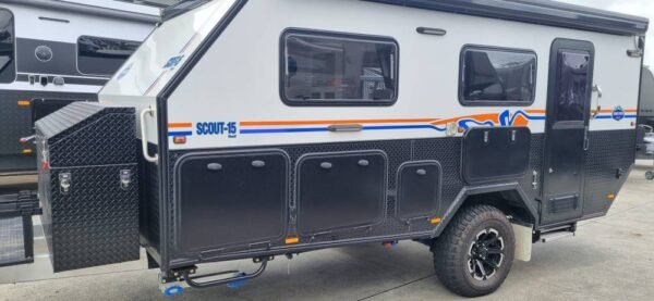 Summary: The caravan in question is a pre-loved 2023 Family Stoney Creek Scout 15ft Bunk Model Off Road Hybrid. It is equipped with a variety of features designed for off-road and family holidays. Specifications include a hot dipped galvanized steel chassis, independent trailing arm suspension with shock and coil springs, a front stone guard, and more.Caravan Specifications: – The caravan has a hot dipped galvanized steel chassis, indicating strong and durable construction.- It features an independent trailing arm suspension with shock and coil springs to provide a smooth ride even on bumpy terrains.- A front stone guard is present to protect the caravan from road debris.Caravan Features:- The caravan uses a Cruise Master DO 35 Coupling. – It is equipped with 12″ electric brakes for increased safety and control. – It has 16″ alloy rims with mud terrain tires, including 2 spare tires for added readiness in case of tire damage. – A large front toolbox is included for storage of tools and other necessary items.- The caravan also comes with a VTRON- 240v Power Management System and a DC-Dc Charger for efficient energy management.Comfort and Convenience Features:- The caravan is fitted with a Trauma roof-mounted air conditioner to regulate temperature. – It includes 2 gas bottles for cooking and heating purposes.- Jerry can holders are provided for convenient storage of water or fuel cans.- A 12V pump is in place for various uses such as inflating tires or air mattresses.- The caravan houses 2 x 120L water tanks and 1 x 75L waste tanks, ensuring ample water supply and waste management during trips. Kitchen and Dining Features:- The caravan includes an external slide-out kitchen for convenient outdoor cooking.- A 49L internal fridge and a 35L Coolman 12-volt external dual zone are present for food and beverage storage.Sleeping Arrangements and Sanitation Facilities:- The caravan offers a king-size main bed and twin side bunks, providing comfortable sleeping arrangements for a family. – A rear ensuite with a toilet and shower is included for personal hygiene and convenience.
