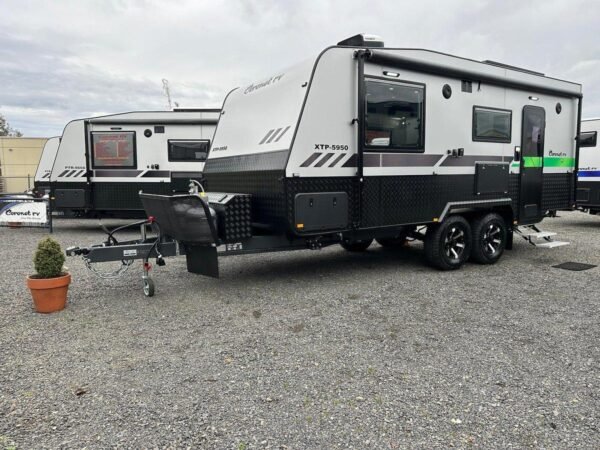 The Coronet XTP (X Trail Package) series incorporates a strong Meranti frame with modern silver Alucom exterior flat wall finish as standard with durable black chequer plating. (Alternate colour options available) The use of innovative electronics such as a reversing camera and ALKO ESC stability control will ensure you have a safe stress free drive to your destination. Fitted with a quality 12v deep cycle chassis mounted batteries and incoming charge from the 2 x 200w solar panels, 2 x large water tanks and grey water, this van is fully setup for free bush camping at your favourite destination.