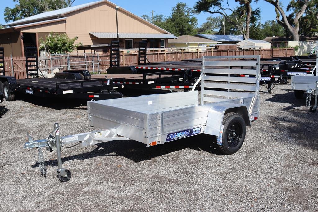 2026 Aluma 4.5×8 utility trailer with 12″ solid side kit, aluminum floor, torsion axle, tailgate, and black spoke wheels. Lightweight and durable. VIN: 305855. This 2026 Aluma 4’6” x 8’ single axle utility trailer (Model: 548ESA-S-TG) is the ideal lightweight solution for hauling small equipment, lawn gear, or personal cargo. Built with an extruded aluminum floor and 12″ solid rack side kit, it offers both durability and containment. The trailer has a GVWR of 2000 lbs and a carry capacity of 1610 lbs.